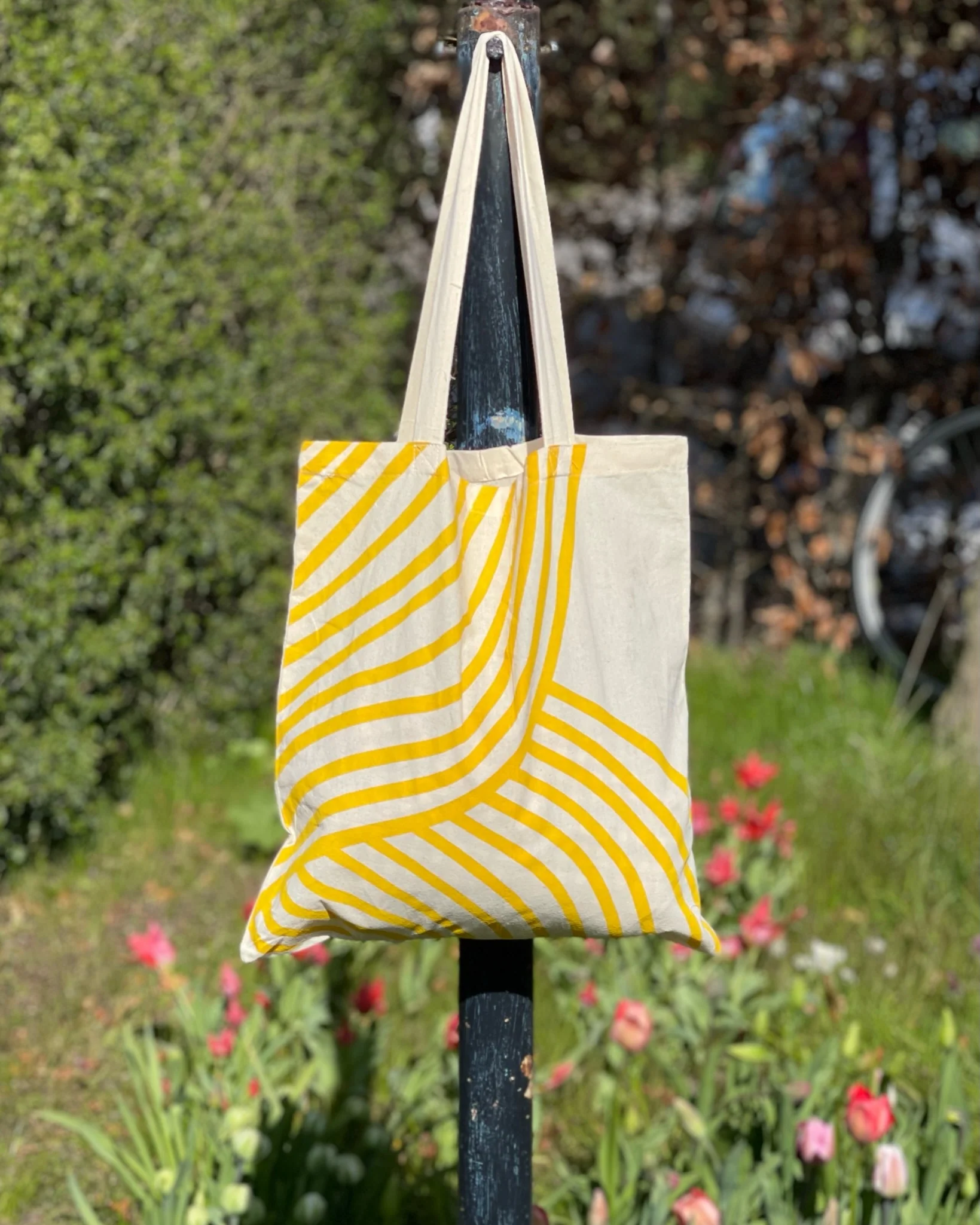 Stilleben bomuldstaske med flotte gule striber og Stilleben logo på modsatte side. Stillebens visuelle identitet er designet af All The Way to Paris.